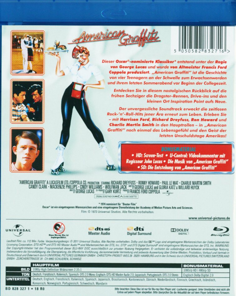 Dieser Oscar®-nominierte Klassiker entstand unter der Regie von George Lucas und wurde von Altmeister Francis Ford Coppola produziert. "American Graffiti" ist die Geschichte von vier Teenagern an der Schwelle zum Erwachsenwerden und ihrem letzten Sommerabend vor Beginn der Collegezeit.Entdecken Sie in diesem nostalgischen Rückblick auf die frühen Sechziger die Dragster-Rennen, Drive-Ins und den kleinen Ort Inspiration Point aufs Neue.Der unvergessliche Soundtrack erweckt die zeitlosen Rock'n'Roll-Hits jener Ära erneut zum Leben. Erleben Sie - mit Harrison Ford, Richard Dreyfuss, Ron Howard und Charlie Martin Smith in den Hauptrollen - in "American Graffiti" noch einmal das Lebensgefühl und den Geist der letzten Unschuldstage Amerikas!