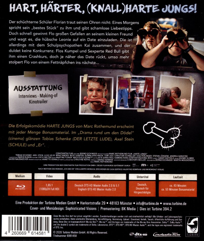 Hart, härter, harte Jungs! Der schüchterne Schüler Florian traut seinen Ohren nicht: Eines Morgens spricht sein "bestes Stück" zu ihm und gibt schamlose Liebestipps. Doch schnell gewinnt Flo grossen Gefallen an seinem kleinen Freund und wagt es, die hübsche Leonie auf ein Date einzuladen. Die ist allerdings mit dem Schulpsychopathen Kai zusammen, und der duldet keine Konkurrenz. Flos Kumpel und Sexperte Red Bull gibt ihm einen Crashkurs, doch je näher das Date rückt, umso mehr stolpert Flo von einem Fettnäpfchen ins nächste... Die Erfolgskomödie HARTE JUNGS von Marc Rothemund erscheint mit jeder Menge Bonusmaterial. Im "Drama rund um den Dödel" (cinema) glänzen Tobias Schenke (DER LETZTE LUDE), Axel Stein (SCHULE) und "Er".
