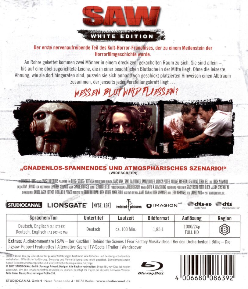 Der grandiose erste von sieben Teilen der ultrabrutalen spannenden "SAW" Reihe in schöner Optik und mit erstklassigen Darstellern...