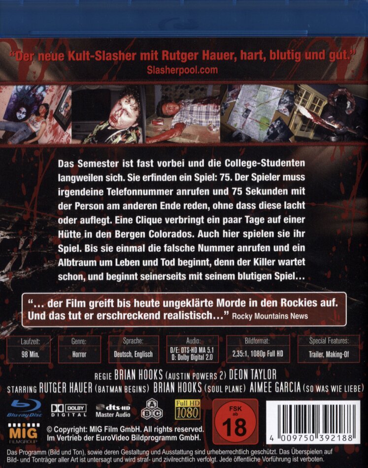 Eine Clique verbringt ein paar Tage auf einer Hütte in den Bergen Colorados. Eines Abends spielen sie ein erfundenes Spiel: "75". Jeder muss irgendeine Telefonnummer anrufen und mindestens 75 Sekunden mit der Person am anderen Ende der Leitung reden, ohne dass diese lacht oder auflegt. Die Jugendlichen amüsieren sich bestens. Doch dann begehen sie einen verhängnisvollen Fehler - ohne es zu wissen wählen sie die Nummer eines psychopathischen Serienkillers. Für die Studenten beginnt von nun an ein gnadenloser Albtraum und ein Kampf um Leben und Tod: Der Killer macht sich auf die Suche nach ihnen. Als er sie gefunden hat, beginnt er seinerseits mit seinem blutigen Spiel und kennt keine Gnade...