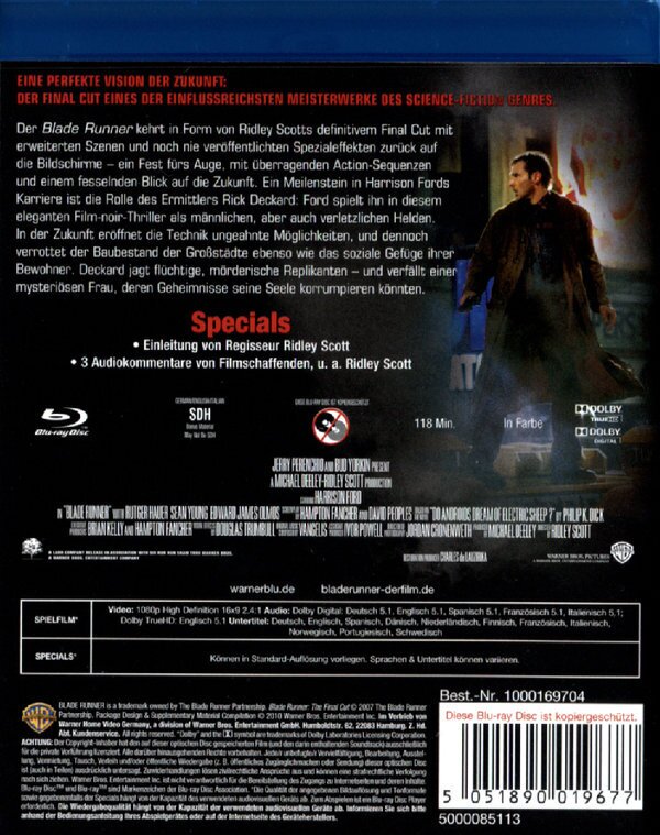 Spitzenfilm, unschlagbare Atmosphäre. Final Cut bedeutet, dass Scott hier einiges ausgebessert hat, das Wichtigste: als der Cyborg die Taube fliegen lässt, ist der Himmel jetzt dunkel und bewölkt (wie im ganzen Film), und nicht wie vorher à la Sonnenschein.