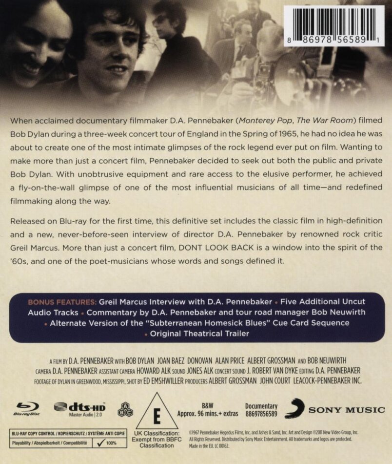Ein Luxus-Paket mit dem Kultfilm von 1967, gefilmt anlässlich der UK-Tour von 1965 mit einigen Ueberraschungen, Konzertaussc hnitte,Interviews,Garderoben-Stimm ungen,Fans,eine zusätzliche unveröffentlichte Dokumentation auf einer separaten DVD, ein 155-seitiges Buch mit Infos,Fotos,Interviews aus dem Film, sowie ein kleines Daumenkino mit Bob Dylan. Ein Muss für alle Dylan Fans.