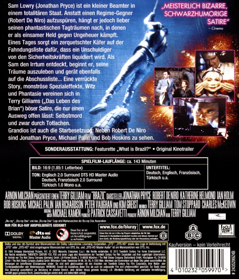 Der wohl beste Terry Gilliam Film. Ein düsterer Film in einer Kafka (Der Prozess) Welt. Ein Film für Träumern der Hoffungen gibt. Für diesen Film hat Terry Gilliam die Golden Palme von Cannes gewonnen. Wer Kafka mag wird diesen Film lieben, und jetzt zum Schnäppchenpreis, sag ich nur eins. Zugreifen!