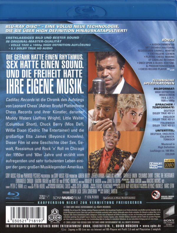 Das Release zeichnet sich durch eine grundsolide Bildqualität aus, doch dem etwas verwaschenen Transfer fehlen HD-Merkmale wie Schärfe und Plastizität. Die verlustfreie deutsche Tonspur transportiert den unvergesslichen Zeitgeist des Blues vorzüglich, wenngleich die Dynamik und Wucht der Klassenbesten nicht ganz erreicht wird. Die blaue Scheibe kann aber mit ihrer umfangreichen und interessanten Ausstattung punkten. Über die BD-Live-Funktion können mit dem Chess Record Player sogar Musiktitel des Soundtracks per E-Mail verschickt werden.