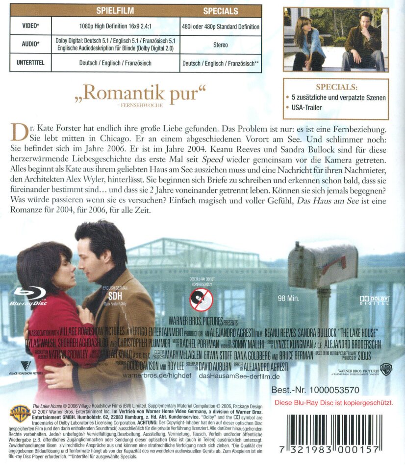 Zum Glück sind geschmäcker verschieden und dies mus snicht jedem gefallen. Aber The Lake House ist wunderbar. Die Botschaft im Film ist einfach himmlisch und es ist pure Romantik.
