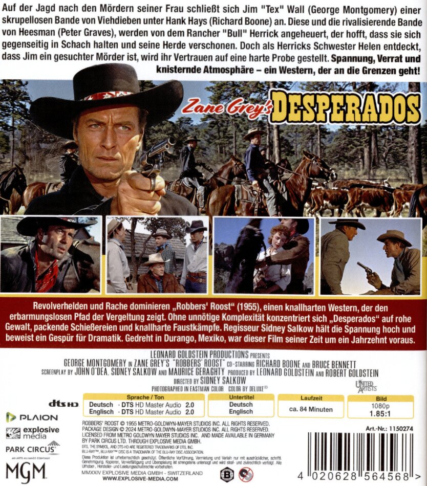 Revolverhelden und Rache dominieren „Desperados“ aus dem Jahr 1955, einem stahlharter Western, der einen methodischen Weg zur Rache untersucht. George Montgomery spielt einen Cowboy auf einer besonderen Mission, der sich mit Viehdieben anlegt und dabei einen zwielichtigen Komplizen (Richard Boone) trifft, während ein anderer (Peter Graves) geradezu antagonistisch ist, was die Jagd nach dem untröstlichen Helden erschwert. „Desperdos“ ist kein komplexer Genrefilm, sondern begnügt sich mit den Grundlagen von Einschüchterung und gewalttätigem Verhalten, lässt Schiessereien und Faustkämpfe nicht aus, während Regisseur Sidney Salkow die Spannung gekonnt aufbaut und am Laufen hält.