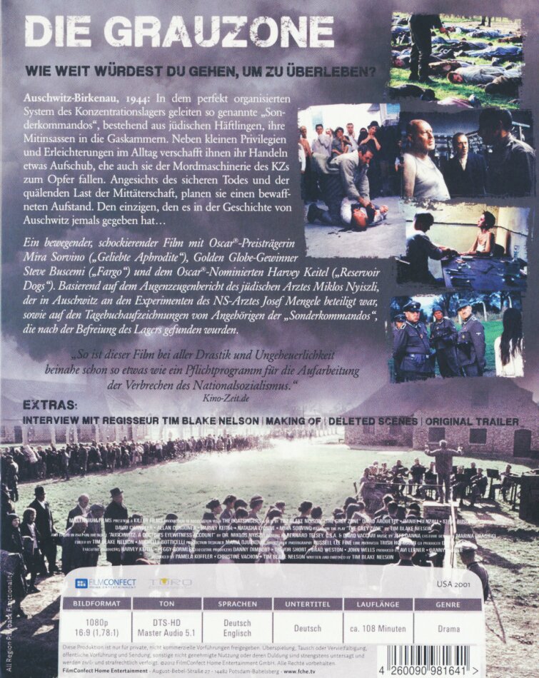 Wenn sich ein Autor und Regisseur vornimmt, die Geschichte dieser Sonderkommandos zu erzählen, steht er vor dem grossen Problem der filmischen Darstellbarkeit. In den inzwischen zu einem eigenen Genre gewordenen ?Holocaust-Filmen? wird nämlich gerade diese letzte Stufe der Ermordung der europäischen Juden immer ausgespart und lediglich angedeutet. Tim Blake Nelsons Film THE GREY ZONE zeigt nur diese. Mit durchweg guten Darstellern setzt Regisseur Nelson sein gleichnamiges Bühnenstück um, das die Hoffnungslosigkeit dieser dunklen Zeit fühlbar macht und gleichzeitig zeigt, dass es auch in der schwärzesten Nacht Gemeinschaft, Mitgefühl und Mut gab. Keine leichte Kost, aber doch ein sehr sehenswertes und nachdenklich stimmendes Drama.