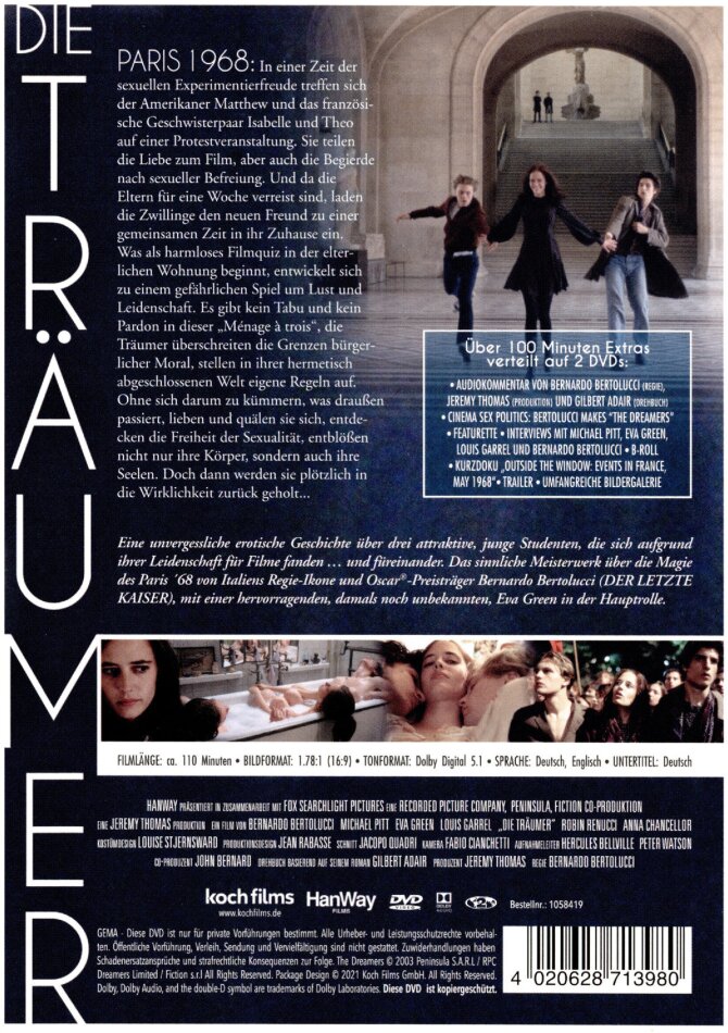 Eine unvergessliche erotische Geschichte über drei attraktive, junge Studenten, die sich aufgrund ihrer Leidenschaft für Filme fanden ... und füreinander. Das sinnliche Meisterwerk über die Magie des Paris ´68 von Italiens Regie-Ikone und Oscar®-Preisträger Bernardo Bertolucci (DER LETZTE KAISER), mit einer hervorragenden, damals noch unbekannten, Eva Green in der Hauptrolle.