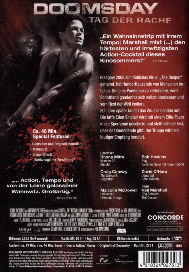 Grossbritannien scheint einen Ausrottungs-Komplex zu haben: 28 Days / Weeks Later, Reign of Fire, Shaun of the Dead :-) ... Na ja, aber wo sonst kann man Moderne und Mittelalter so schön vermischen? Auf jeden Fall ist Doomsday technisch einwandfrei, gut inszeniert, spannend und, Mad Max sei dank, auch noch auf skurille Weise irgendwie witzig. Aber wer hätte bei Ali G gedacht, dass Rhona Mitra so auf die Nuss klopfen kann?!