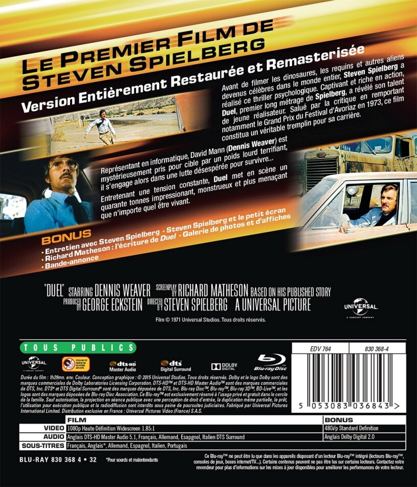 Ich habe "DUELL" vor einigen Jahren im TV gesehen und konnte dem Film schon damals (noch als Teenager) etwas Faszinierendes und zugleich Schockierendes abgewinnen!Eine Horrorvorstellung von einem rostigen 40t-Tanklaster-Monstrum verfolgt zu werden!Spielbergs erstes Meisterwerk aus dem Jahre 1971!KULT!!!Bild- und Tonqualität auf der DVD sind voll in Ordnung!Sehr empfehlenswert!