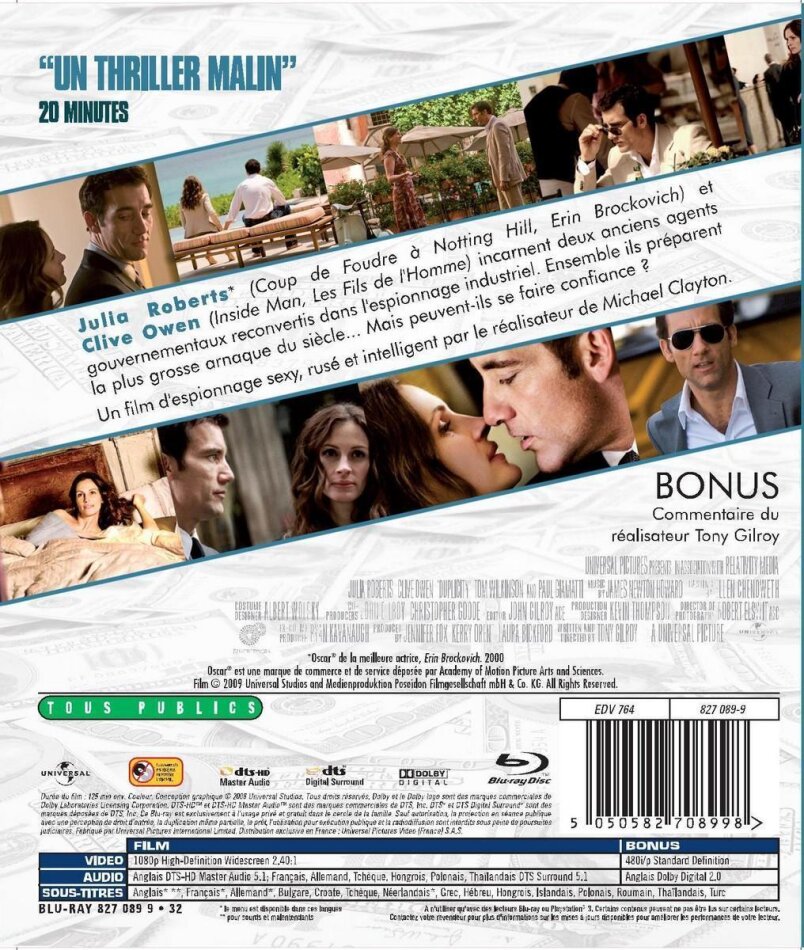 Zugegeben,ich bin mittlerweile ein Fan von T. Gilroy und C. Owen geworden.Insofern hat mein Urteil über diesen Film schon einen Bonus,der mich nicht enttäuscht hat. Fazit: Eine beim 1. Mal ansehen verwirrende Story. Die Geschichte wird rückwärts erzählt mit etlichen Zeitsprüngen,die einen durchaus verwirren können. Also muss der Zuseher dem Verlauf aufmerksam folgen. So zum entspannten berieseln ist diese Produktion ungeeignet. Verschachtelt, mit originellen Übergängen, einer überzeugenden cast und eben der auch ungewöhnlichen Story enthält eben diese manchmal Spannung, eine augenzwinkernde Komik und ein bisschen Realsatire über die Geheimhaltung und Spionage im Kosmetikgeschäft. Wie "Michael Clayton" ist es ein ausgezeichneter, aber sehr spezieller Film,der nicht bei jedem Begeisterung auslösen wird.