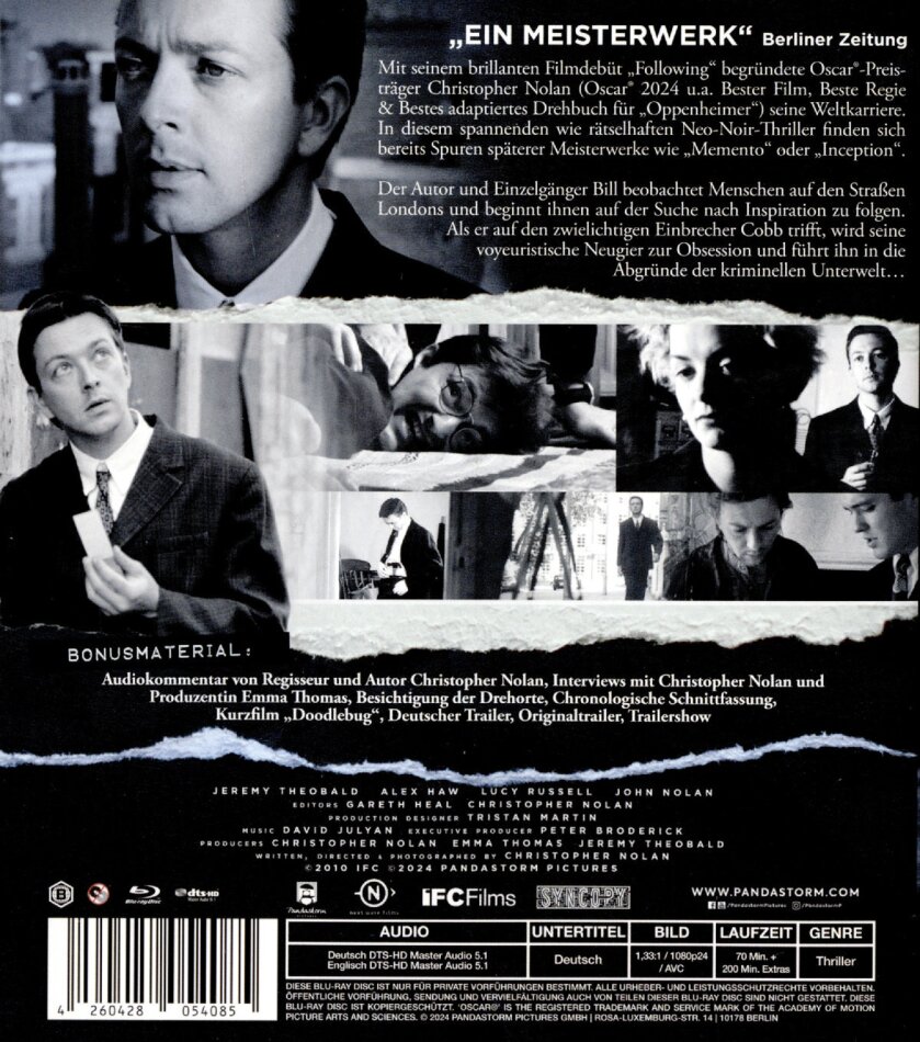 Als Liebhaber des Kultmovies "Memento" mochte ich auch bei "Following" die Tatsache, dass man als Zuschauer mitdenken muss, um Handlung, Charaktere und Details zu entdecken und verstehen. Als Strickzeug ruhig weglassen!!