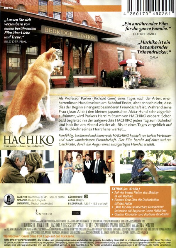 Ein schöner und sehr bewegender Film, der auf einer wahren Begebenheit beruht. Es ist echt faszinierend zu sehen und zu wissen, wie STARK eine Bindung zwischen Mensch und Tier sein kann!!!! Meine Freundin hat wie ein Schloßhund geheult, als Hachiko 10 Jahre lang auf sein Herrchen gewartet hat. Ein echt gelungener Film! Bildquali ist sehr gut und der Ton superklasse! Extras ( 30 min Making Of...) wären noch etwas ausbaufähig gewesen, sonst gibts aber nix zu bemängeln. Wendecover!