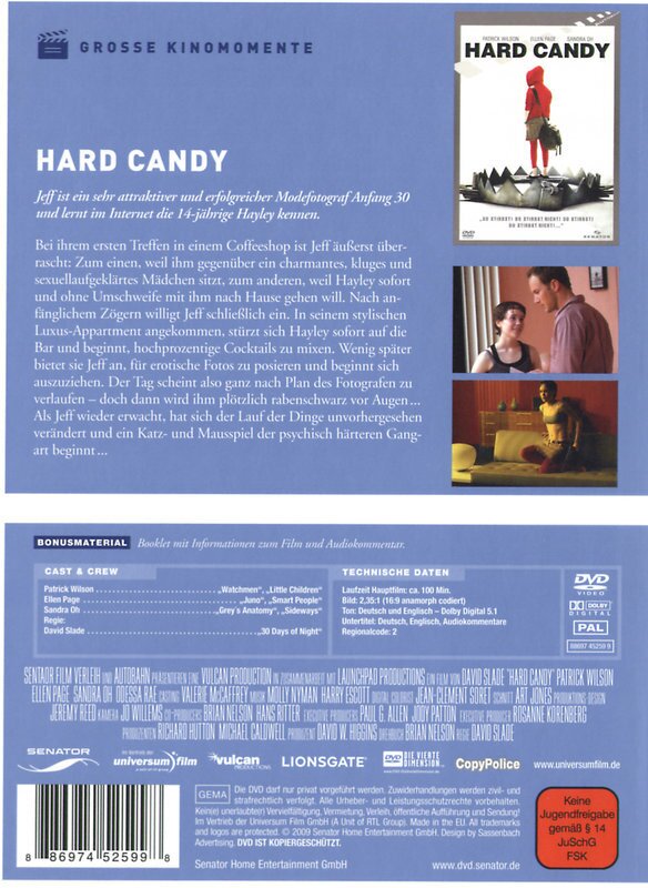 Die junge Ellen Page, die hier einfach fabelhaft agiert, war zur Zeit der Dreharbeiten gerade mal eben 17 Jahre alt. Regisseur David Slade der vorher Werbefilme, Videoclips und einen Kurzfilm drehte, dringt mit seinem in farbintensiven Bildern gehaltenen Debütfilm auf den Zuschauer ein, dass es schon eine ausgesprochen harte Erfahrung ist. Dieser fintenreiche Psycho-Thriller der sich ausschliesslich um seine beiden Hauptprotagonisten dreht, zeigt eine ungemein fesselnde und abgründige Geschichte mit ausschweifenden Dialogen. HARD CANDY zeigt eindringlich, wie krank die Gesellschaft doch ist, und was Hayley hier für ein Psycho-Duell mit ihrem ahnungslosen Widersacher abliefert ist ganz schön harter Tobak. -
