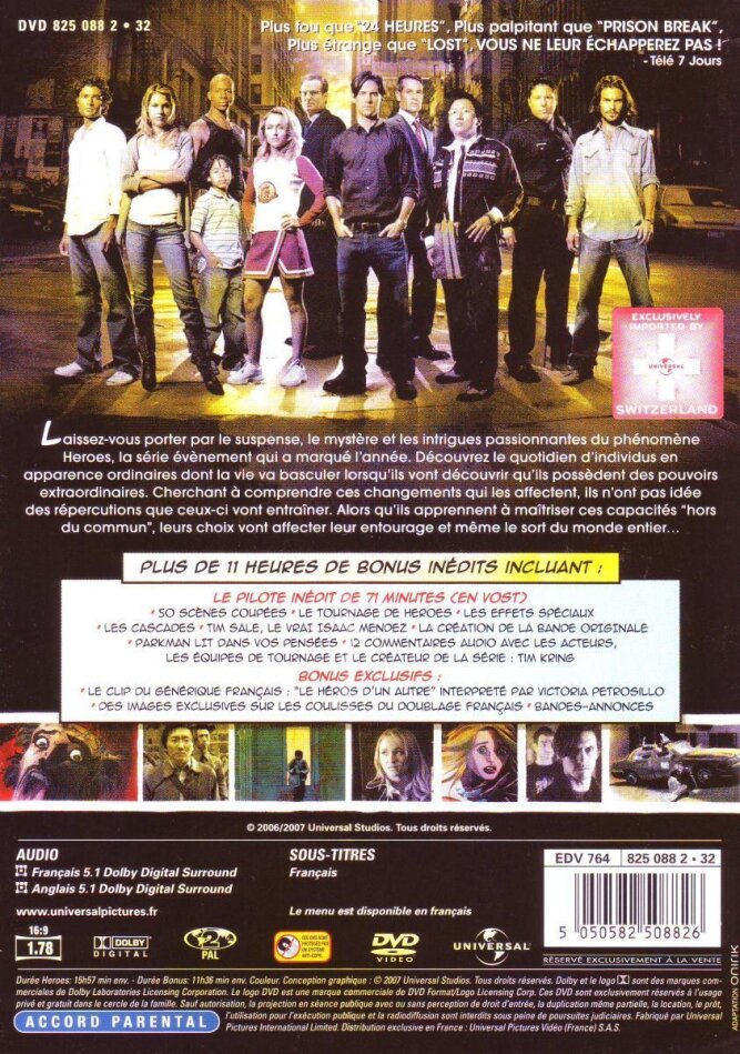 Die Serie finde ich ganz gut. Über den neuen Sendeplatz (SF2) verliere ich besser kein Wort. Am besten sieht man sich den Piloten an und wartet dann, bis die Silberlinge kommen. Leider auch hier wieder in einer geteilten Box. Da ich diese Verkaufspraxis aus Prinzip boykottiere, wird Heroes trotz seiner Qualität betreffend Cast und Story (inkl. der gelungenen deutschen Synchro) leider bis auf weiteres nicht in meinem Regal stehen.