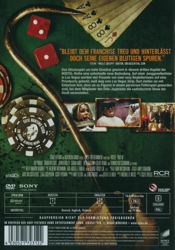 Das Glücksspiel um hohe Einsätze gewinnt in diesem dritten Kapitel der HOSTEL-Reihe eine unheilvolle neue Bedeutung. Auf einer Junggesellenfeier in Las Vegas werden vier Freunde von zwei sexy Begleiterinnen auf eine Privatparty gelockt, weit weg vom Las Vegas Strip. Dort stellen sie mit Entsetzen fest, dass sie zu Figuren in einem perversen Folterspiel geworden sind, bei dem Mitglieder des Elite-Jagdclubs die sadistischste Show der Stadt veranstalten.
