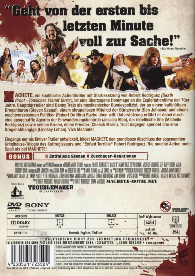 Einfach nur geil! Der typische Grindhouse-Style. Danny Trejo in seiner Paraderolle, als einsamer, harter Kämpfer der sich von niemandem auf die Kappe sch...... lässt und seinen Feinden nicht nur eine aufs Maul gibt:-). Eine Besetzung die Ihres gleichen sucht, die man in solch einem Film nicht erwarten würde. Robert Deniro, Steven Seagal etc. Einer der coolsten Actionfilme die ich je gesehen habe. Blutig, brutal, coole Sprücheklopfer, übertrieben und nie ohne die nötige Portion schwarzen Humor. Man merkt auch wie die Darsteller spass an ihren Rollen haben und sich darin selber nicht zu ernst nehmen. Eine der coolsten Szenen: Machete wird im Spital vom Arzt, nach einem Fight, behandelt. Arzt zur Krankenschwester- "Schwester wussten sie das der menschlich Dünndarm etwa zehn mal so lang ist wie der Mensch selber?"- Nächste Szene- Die Killer kommen ins Spital um Machete kalt zu machen. Machete schlitzt einem den Bauch auf und seilt sich mit seinem Darm durchs Fenster ab. So eine Art makaberwitziges Bunggejumping :-)