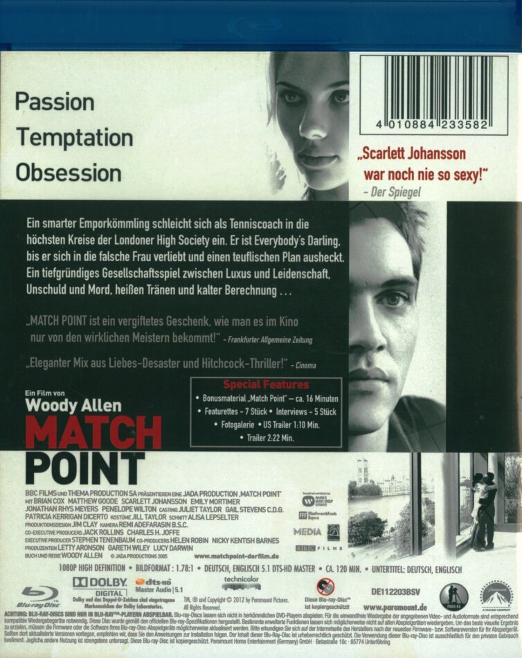 Woody Allen's neuester Film spielt in London's upper class? Was überall auf der Welt, nur nicht in England, mit Lob überhäuft wurde, ist in Tat und Wahrheit tatsächlich einer der besten Filme von Woody Allen in den letzten, ähh, 10 Jahren. Wie aus der Liebes- und Karrieregeschichte eine Kriminalgeschichte wird, dies alles verlinkt mit den grossen literarischen Referenzen, und der rabenschwarze Humor natürlich mithinein fliesst, ist, gelinde ausgerückt, grosses zeitgemässes Kino. Scarlett Johannson dürfte mit dieser Rolle überdies die grosse Actrice der 00er werden (selbstverständlich lebt sie immer noch vom Bonus aus Lost in translation).