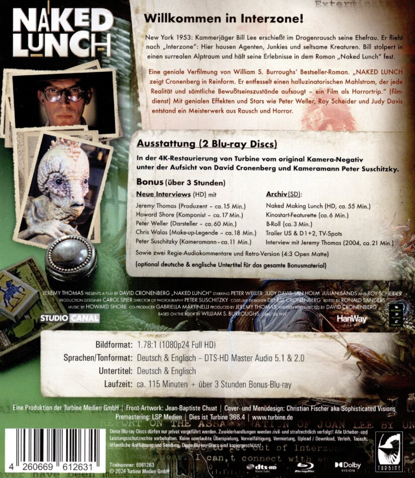 Der da unten hat ja keine ahnung was er da schreibt. Cronenberg hat burroughs buch naked lunch verfilmt. burroughs bevorzugte es in manchen büchern seine texte auseinanderzuschneiden und dann wieder neu zusammenzusetzen. so auch naked lunch, was es nicht unbedingt ganz durchschaubar macht. cronenberg hat elemente des buches genommen und sie mit biographischen einzelheiten aus burroughs leben (er hat wirklich seine frau beim wilhelm tell spiel erschossen!!!) vermischt. So! Buch ist Top. Film ist Top. DVD Schrott. Nicht mal Originalton. Aber hier zu sagen dass ich das alles verstehe tu ich auch net!