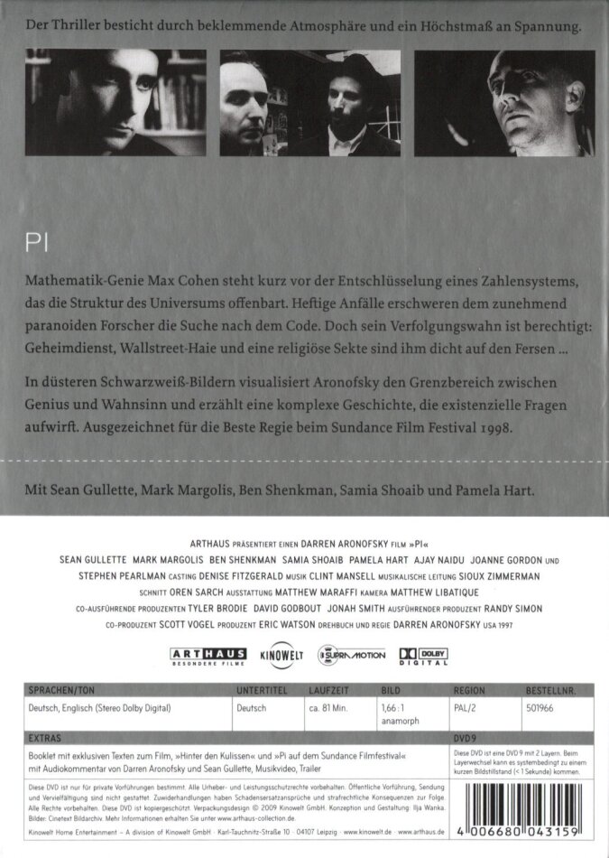 aronofsky's erstes werk hat nicht übersehbare parallelen zu "requiem for a dream". der film ist schwarzweiss und man wird rein visuell sehr schnell in den bann gezogen. erinnert zum teil sehr an lynch's erstling "eraserhead". die story ist wirr, wirft fragen auf. man muss sich wirklich konzentrieren bei diesem film...