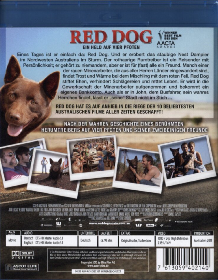 Wenn Produktionen aus Down-Under auf DVD erscheinen sind sie meistens einen Blick wert. Entweder weil sie so wunderbar altmodisch-schwülstig sind (z.B. "Australia"), einen verschrobenen Humor (z.B. "Crocodile Dundee") haben oder eigenartig spannend sind. "Red Dog" hat einen ähnlichen Humor, Melancholie und diese wir-sind-anders-Mentalität. Fazit: An "Hachiko" erinnert diese Geschichte schon ein wenig. Nur das dort manchmal der etwas dick aufgetragene cry-baby Effekt einen deprimiert. Red Dog hat dies einige Dimensionen weniger und bietet gleichzeitig Aufheller, welche die spröde Natur West-Australiens mit dem rauhen Gemüt der Bewohner wieder sympathisch erscheinen lässt. Auch der soundtrack passt. Besser im O-Ton.