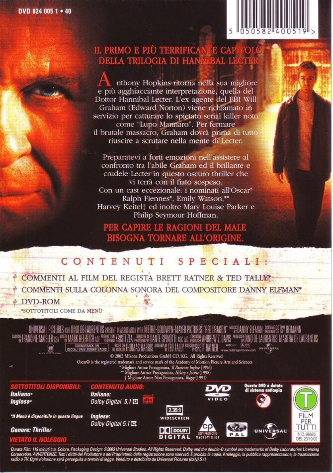 "red dragon" kommt zwar nicht ganz an das "schweigen der lämmer" heran, ist jedoch deutlich besser als "hannibal".anthony hopkins ist wieder in seinem element, grosse überraschung ist edwart norton, meiner meinung nach der jocker im film.