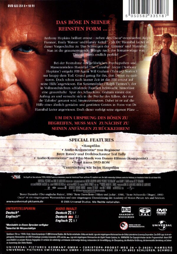Zum Film: Starke Verfilmung des Romans, stellenweise sogar besser als das Original "Manhunter". Minuspunkte: Um Anthony Hopkins Gagenforderung zu rechtfertigen, hat man die Szenen mit Hannibal Lecter künstlich verlängert und dem Fil somit eine zu starke "Schweigen der Lämmer"-Note aufgedrückt. Und dann noch die Abweichung vom Ende in letzter Minute, das war unnötig. Im Original tötet nämlich GRAHAMS FRAU den Killer, nachdem Graham schwer verletzt am Boden liegt. -