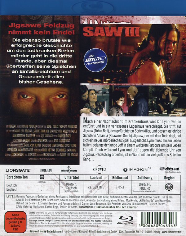 Der grandiose dritte von sieben Teilen der ultrabrutalen spannenden "SAW" Reihe in schöner Optik und mit erstklassigen Darstellern...