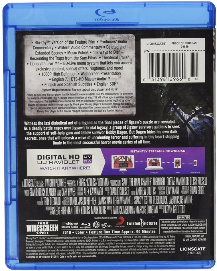 Bei Teil 7 fehlt besagter Zusatz bzw nur ein "Unrated"-Hinweis ziert die seit dem 25. Januar 2011 in Amerika erhältliche Blu-ray-VÖ. Was dann der nächste kritische Punkt ist: Ja, tatsächlich ist Saw 3D der erste Film der Reihe, der dem unangenehmen Trend folgt, dass die längere Fassung ausschließlich auf Blu-ray und nicht auf DVD erhältlich ist.