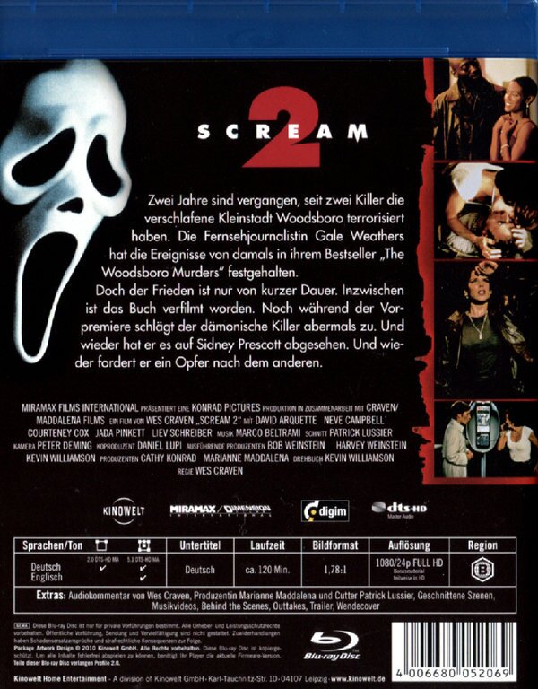 Wer den ersten Teil von Scream mochte, wird auch von diesem nicht enttäuscht sein. Obwohl er nicht allzu viel Neues bietet, ist er immer noch wahnsinnig packend - im Gegensatz zur Fortsetzung Scream 3!
