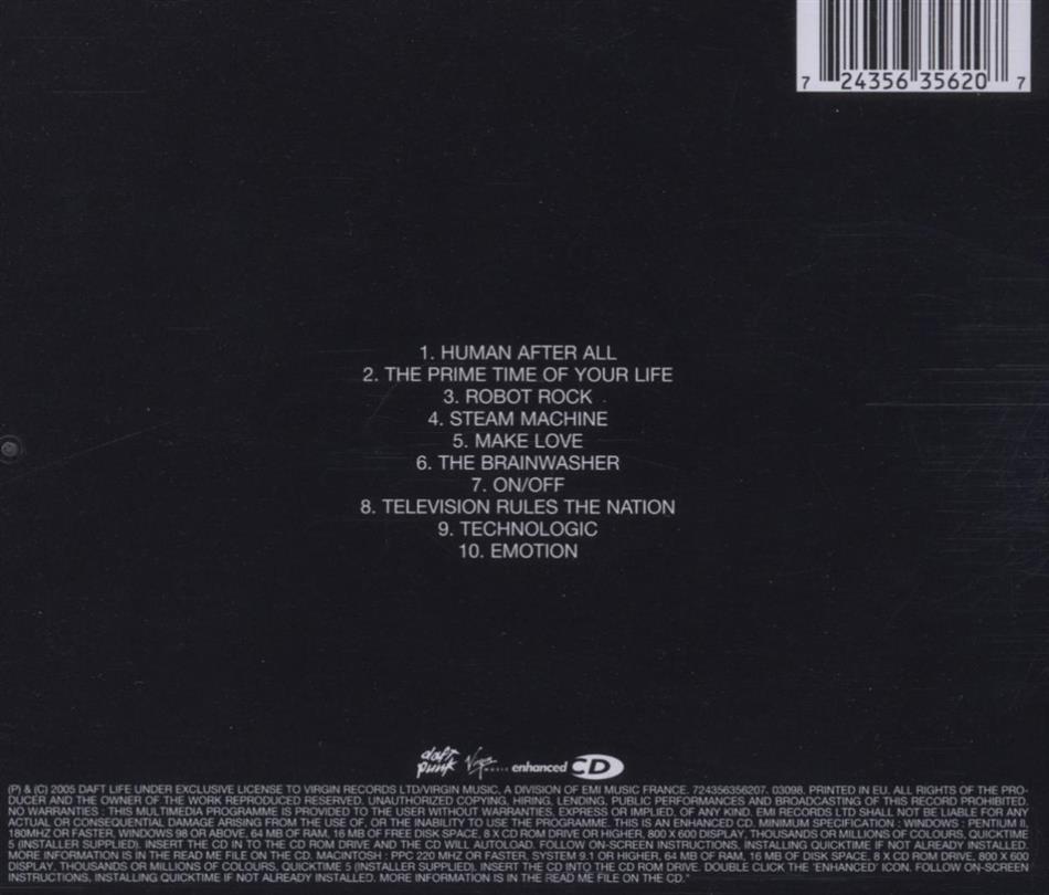 Nach dem eigentlich ziemlich guten "Discovery" (mit seinen zwei Juwelen 'Aerodynamic' und 'HarderBetterFasterStronger') ist "Human After All" wirklich zutiefst enttäuschend. Wie schon gesagt wurde, die zwei Franzosen sind wohl einfach mal auf der Repeat-Taste eingeschlafen und haben sich dann erlaubt das Resultat zu vermarkten. Die meisten Tracks nerven schon nach der ersten Minute. Schade...