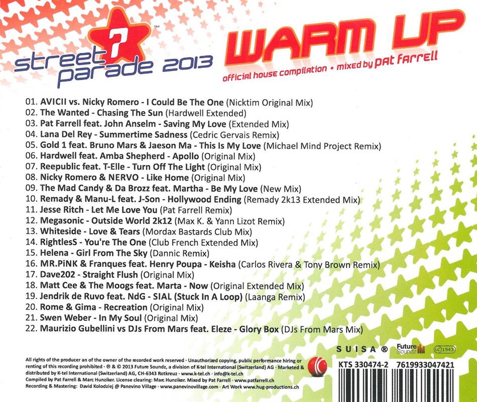 Fast die Hälfte der Titel haben nur schon musikalisch auf einer Streetparade CD nichts zu zuchen. Eine ziemliche Mogelpackung wo die Plattenfirma ohne Szenenbezug offensichtlich versucht schnelles Geld mit der Kommerzparade zu verdienen. Was hat ein DSDS Teilnehmer auf einer Streetparade CD zu suchen - fehlt nur noch Beatrice Egli im Discomix. Ha Ha Ha ;-)
