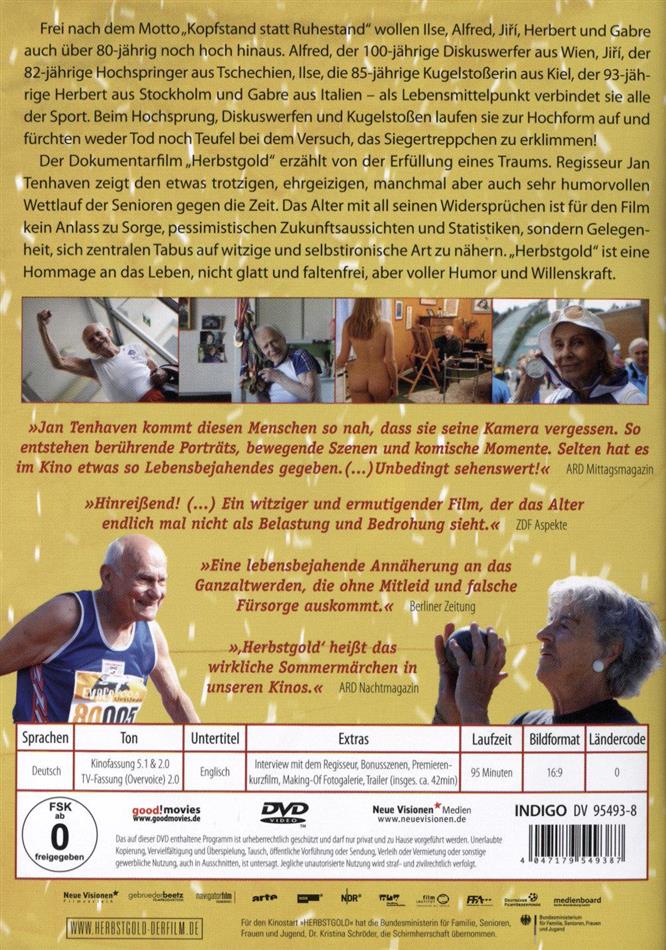 Der Dokumentarfilm "Herbstgold" erzählt von der Erfüllung eines Traums. Regisseur Jan Tenhaven zeigt den etwas trotzigen, ehrgeizigen, manchmal aber auch sehr humorvollen Wettlauf der Senioren gegen die Zeit. Das Alter mit all seinen Widersprüchen ist für den Film kein Anlass zu Sorge, pessimistischen Zukunftsaussichten und Statistiken, sondern auch Gelegenheit, sich zentralen Tabus auf witzige und selbstironische Art zu nähern. "Herbstgold" ist eine Hommage an das Leben, nicht glatt und faltenfrei, aber voller Humor und Willenskraft.