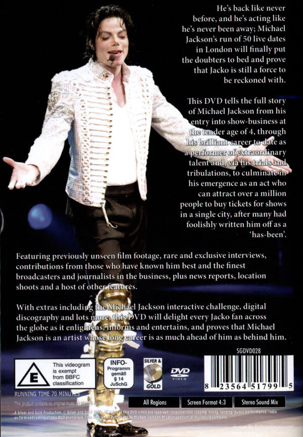 Nach den traurigen und schockierenden Nachrichten über den Tod von Michael Jackson hält die Welt den Atem an. Seine Musik berührt uns, denn er ist ein Phänomen wie kein anderes. Eine Musiklegende ist von uns gegangen. Und seine Werke werden uns noch lange begeistern. Diese DVD erzählt die Geschichte von Michael Jackson von seinem Eintritt in das Show-Business im zarten Alter von 4, durch seine leuchtende Karriere und sein Weltruhm, bis jetzt zu seinem Tod. Das außerordentliche Talent, das millionen von Menschen anzog. Auf der DVD befinden sich seltene und exklusive Interviews, Beiträge der bekanntesten Rundfunksprecher und Journalisten aus der Branche, Nachrichtenbeiträge, umfangreiches und seltenes Filmmaterial. Millionen seiner Fans trauern und es gibt keinen Zweifel über seine Welterfolge. Kurz vor seinem Tod wurden noch 50 ausverkaufte Konzerte in der O2 Arena in London geplant, welche selbstverständlich nicht mehr stattfinden. Aber genau hieran erkennt man wie populär und gefragt er und seine Musik doch waren. Der King of Pop ist in das Rock-and-Roll Hall of Fame eingezogen. Er gewann 13 Grammys und hatte zahlreiche Nummereins-Hits weltweit. Er verkaufte über 750 Million Einheiten.