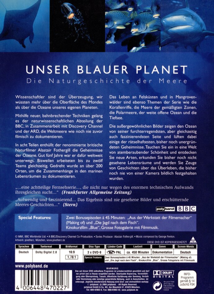 absolut idrücklichi und einzigartigi dvd-kollektion! D wunder vom Meer sind no nie in so sagehaft schöne bilder feschtghalte worde wie in dere vilfach priskrönte BBC-Dokumentation. Luegets euch a, villicht isch es jo nonig z spot für d rettig, wenn nid bald es umdänke bi dem mänsche stattfindet jedoch scho. villicht vermga jo die filmreihe es paar köpf richtig z schalte. peazio