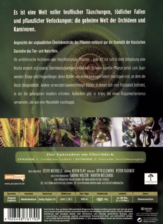 Es ist eine Welt voller teuflischer Täuschungen, tödlicher Fallen und pflanzlicher Verlockungen: die geheime Welt der Orchideen und fleischfressenden Pflanzen. Angesichts der unglaublichen Überlebenstricks in der Pflanzenwelt verblasst gar die Dramatik der liebestollsten Bonobos oder der blutrünstigsten Haie. Alles begann mit den Forschungen von Charles Darwin, der fasziniert war von den Verführungskünsten der Orchideen und den Fangtechniken der Karnivoren. Dem genialen Naturforscher gelang es erstmals nachzuweisen, dass sich viele Blütenformen an bestimmte Insekten anpassen. Die Tricks der Pflanzen sind von einer erstaunlichen Vielfalt und machen sie, ebenso wie viele Tierarten, zu einem perfekten Jäger. Um tierische Beute zu fangen und zu töten, greifen die fleischfressenden Pflanzen auf ganz verschiedene Möglichkeiten zurück. Einige sind Fliegenfänger, deren Blätter von einem klebrigen Sekret überzogen sind. Andere verwenden kannenförmige Blätter mit einer Flüssigkeit, in der die gefangenen Insekten ertrinken. Eine dritte Fangmethode besteht in einem Klappmechanismus, der wie eine Mausefalle zuschnappt. Diese zweiteilige Serie entführt den Zuschauer in eine geheime Welt und zeigt mit atemberaubenden Aufnahmen die fantastischen Vorgänge in der Welt der Pflanzen.
