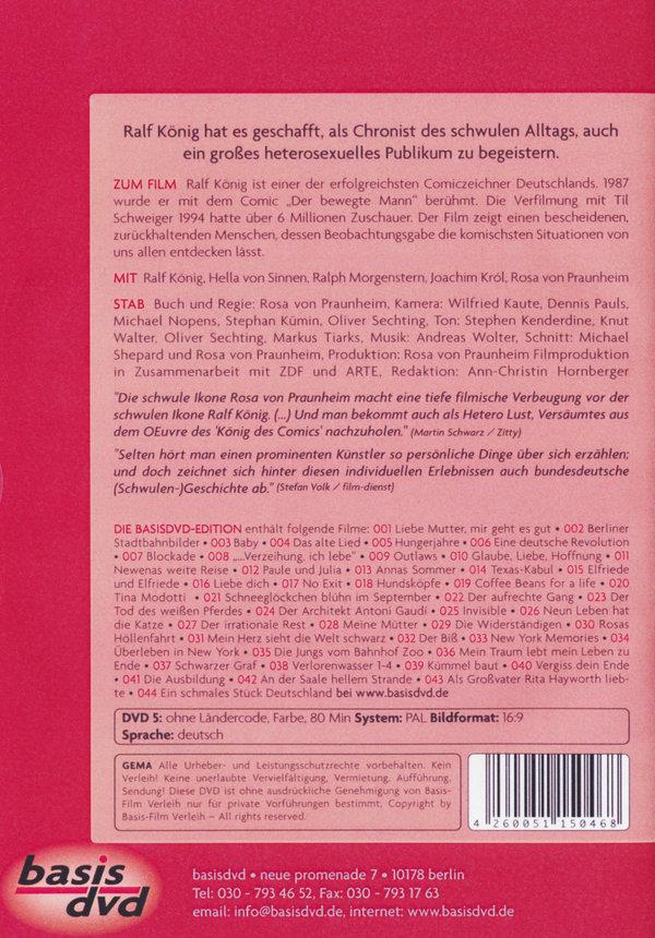 Ralf König ist einer der erfolgreichsten Comiczeichner Deutschlands. 1987 wurde er mit dem Comic DER BEWEGTE MANN berühmt. Die Verfilmung mit Til Schweiger 1994 hatte über 6 Millionen Zuschauer. Er hat es geschafft, als Chronist des schwulen Alltags, auch ein grosses heterosexuelles Publikum zu begeistern. Schamlos zeichnet er schwulen Sex in allen Variationen. Er zeigt mit viel Humor schwule Klischees, von der kreischenden Tunte, dem Lederkerl, der Kulturhusche, um sie im selben Moment zu widerlegen, indem er sie satirisch überzeichnet. Mit seiner Bibeltrilogie macht er sich über die Sexfeindlichkeit der katholischen Kirche lustig und mit mutigen Comics zum Islam zeigt er, dass er keine Angst vor Kontroversen hat. Der Film zeigt den Lebensweg Ralf Königs, aufgewachsen in einem kleinen Dorf in Westfalen, bis hin zu seinen grossen Erfolgen als Comiczeichner. Ralf König wuchs auf dem Land auf, machte eine Tischlerlehre und begann schon früh zu zeichnen. Er zog in die Weltstadt Dortmund und trat dort in der Szene als Elvira Brunftschrei auf. 1981 kam sein erstes Buch in einem Pornoverlag heraus. In Dortmund entstanden Bücher wie DER BEWEGTE MANN, LYSISTRATA und DAS KONDOM DES GRAUENS, die ihn international berühmt machten. Er zog nach Köln und genoss alle sexuellen Freiheiten, die er dann in seinen Comics verarbeitete, zum Beispiel in seinem Buch BULLENKLÖTEN, welches die bayerische Staatsanwaltschaft auf den Plan rief. Im Film bekunden Prominente wie Hella von Sinnen, Ralph Morgenstern und Joachim Król ihre Sympathie.