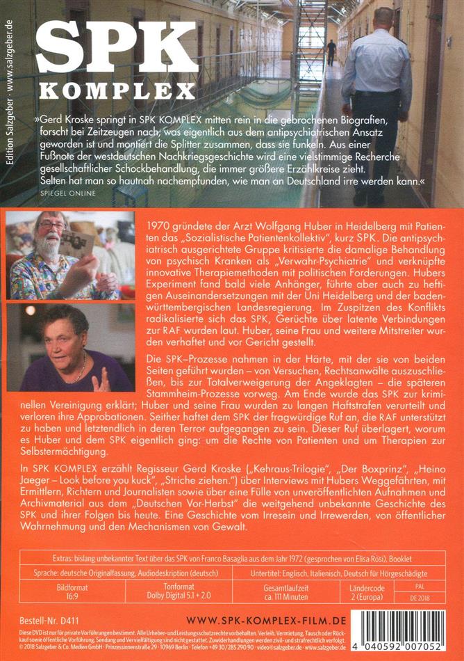 In SPK KOMPLEX erzählt Regisseur Gerd Kroske (u.a. Kehraus-TrilogieDer Boxprinz, Heino Jaeger - Look Before You Kuck, Striche ziehen) über Interviews mit Hubers Weggefährten, mit Ermittlern, Richtern und Journalisten sowie über eine Fülle von unveröffentlichten Aufnahmen und Archivmaterial aus dem Deutschen Vorherbst die weitgehend unbekannte Geschichte des SPK und ihrer Folgen bis heute. Eine Geschichte vom Irresein und Irrewerden, von öffentlicher Wahrnehmung und den Mechanismen von Gewalt.