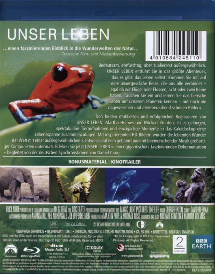 'Unser Leben' entführt den Zuschauer in das grösste Abenteuer, das es gibt: das Leben selbst! Es ist die mächtigste Kraft, die uns alle vereint. Über einen Zeitraum von fünf Milliarden Jahren entwickelte sich das Leben auf der Erde in all seiner Vielfalt, wie wir sie heute kennen. In der aussergewöhnlichen Dokumentation 'Unser Leben' über Flora und Fauna unseres Planeten werden noch nie dagewesene und atemberaubend schöne Bilder vom Verhalten der Tiere und ihres Einfallsreichtums gezeigt. Beeindruckend wird das Phänomen des Lebens geschildert: Aufwachsen, Nahrung finden, Schutz suchen, einen Partner finden, Kinder grossziehen. Wir erkennen so viel von uns in diesen unterschiedlichen Tieren, und viel von ihnen auch in uns. Und so nimmt Dietmar Wunder, die deutsche Synchronstimme von Daniel Craig, in 'Unser Leben' den Zuschauer mit auf eine einzigartige Reise an die schönsten Orte der Welt. Dabei stellt er dem Kinopublikum die grössten - und auch die kleinsten - Stars der Natur persönlich vor: zum Beispiel das Rüsselhündchen in Kenia, das auf eigens angelegter Rennstrecke seinen Verfolgern so trickreich entkommt, dass diese Mühe haben, nicht aus der Bahn geworfen zu werden. Oder die Giganten der Meere: Buckelwale vor Tonga im Südpazifik, die um ein Weibchen buhlen und dabei eine ganz schöne Welle machen. Schneeaffen in den heissen Quellen Japans, die Privilegien der Badekultur herausgebildet haben und deren Einhaltung streng bewachen. Oder die braunen Kapuziner-Äffchen in Boa Vista, Brasilien, die ihren Nachwuchs in der hohen Kunst des Palmnuss-Knackens unterrichten.