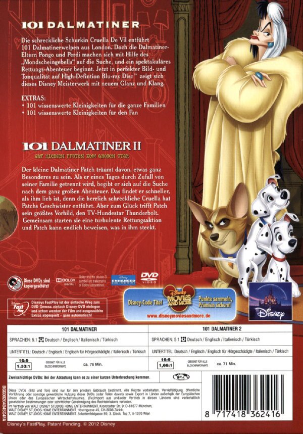Ein behütetes Zuhause mitten in London und ein Wurf drolliger Hundewelpen - für das Dalmatinerpaar Pongo und Perdi scheint das Glück perfekt. Wäre da nicht die extravagante Cruella de Vil! Pelze sind ihre ganze Leidenschaft, und besonders angetan haben es ihr Pelzmäntel aus Dalmatiner-Welpenfell!
