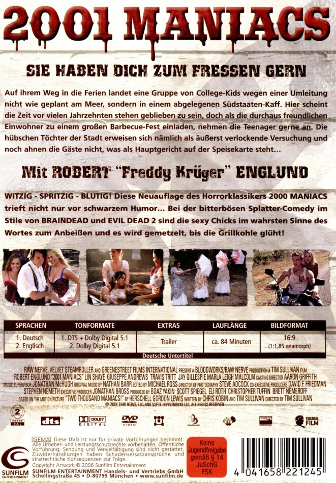 Ein Remake von Hershell G. Levis "2000 Maniacs". Mir persönlich hat das Original besser gefallen, doch aus das Remake hat seinen reiz, da heute kaum noch gute Splatter Filme gemacht werden.