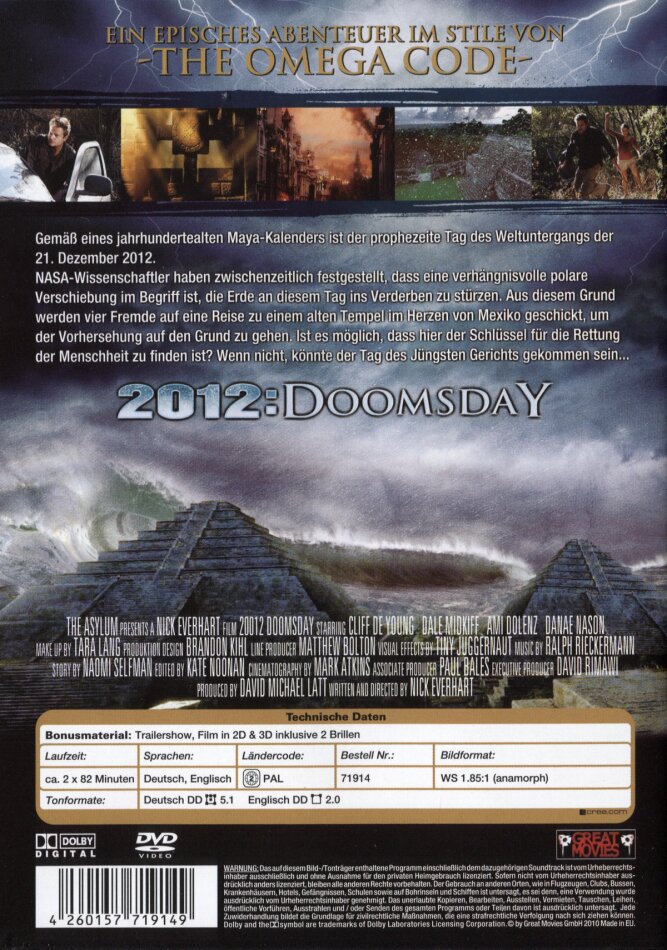 Der Film hat eine gute Geschichte die ein wenig auf phantasie passiert. Der ablauf des Film ist ein wenig hektisch und man bekommt zuwenig informationen was eigentlich 2012 mit dem Mayakalender zu tun hat, auch über die NASA wird nichts erwähnt, was der Film auf 82min länge wirklich zuspricht. Meine bewerkung dazu: Kann dazu nur sagen ein gemisch zwischen Drama und Katastophenfilm, Spannung ist keine rede wert,