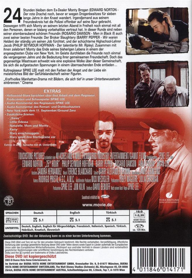 Eine interessante Geschichte von einem Dealer, der von der Polizei mit Drogen zu Hause erwischt wird. Bis er ins Gefängnis muss, bleiben ihm 25 Stunden, um herauszufinden, wer seiner Freunde ihn verpfiffen hat. Mit seinen beiden Freunden und seiner Freundin verbringt er seine letzten Stunden in Freiheit. Bewegendes Drame über Freundschaft und Verrat. Spike Lee nimmt sich die Zeit für die einzelnen Charaktere und zeigt deren Schwächen, herausragend natürlich wie immer Edward Norton.