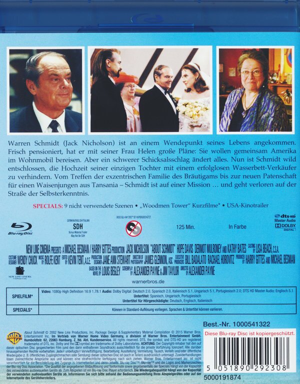 Tja, Jack Nicholson kann eben doch mehr als nur fies grinsen...:) Seine Rolle als rüstiger Rentner Schmidt, der von einem Tag alles verliert, was ihm wichtig scheint, scheint ihm irgendwie auf den Leib geschnitten zu sein. Also ich nehm' ihm das voll ab, mit der verwirrten Art und wie er auf seiner Reise wieder zu sich selber findet. Kathy Bates' Skandalszene? Sicherlich nicht jedermanns Geschmack, aber hey, ist ja nur 'ne Filmrolle. Und sie macht das ganz gut als durchgeknallte Althippiemutter. Auf jeden Fall lohnt es sich, diesen Film anzuschauen! Gefühlskino mit einem Schuss Tränen...!