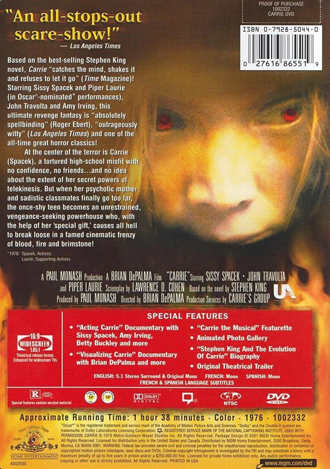 D'abbord, Carrie est un (le ??) meilleurs films d'horreur jamais réalisés. Une histoire de Stephen King mise en scène par Brian de Palma (alors à son sommet) et interpreté (magnifiquement) par Sissy Spacek, ça ne pouvait etre que bon, mais c'est finalement bien plus : un classique absolu. Et puis les bonus sont fabuleux, surtout les deux documentaires sur les acteurs et la production. Personnelement, c'est mon dvd le plus précieux.