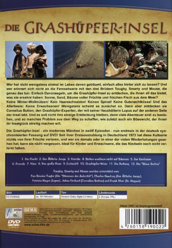 Wer hat nicht wenigstens einmal im Leben davon geträumt, einfach alles hinter sich zu lassen? Und wer erinnert sich nicht an die Fernsehserie mit den drei Brüdern Toughy, Smarty und Mouse, die genau das tun: Einfach davonsegeln, um die Grashüpferinsel zu entdecken, die ihnen all das bietet, was sie ersehnt haben: Sonne, Sand, Bäume voller Früchte und frischen Fisch aus dem Meer? Keine Winter-Wollmützen! Kein Haareschneiden! Keinen Spinat! Keine Gutenachtküsse! Und das Allerbeste: Keine Erwachsenen! Wenigstens scheint es zunächst so. Dann aber entdecken sie Cornelius Button, den Grashüpfer-Experten, der mit seiner Haushälterin Lupus auf der anderen Seite der Insel lebt. Und es soll nicht ihre einzige Entdeckung bleiben, denn viele Abenteuer sind zu bestehen, und so manches Problem aus dem Weg zu schaffen, wie zuletzt auch ein Bösewicht, der ihnen ihr Glück streitig machen will.