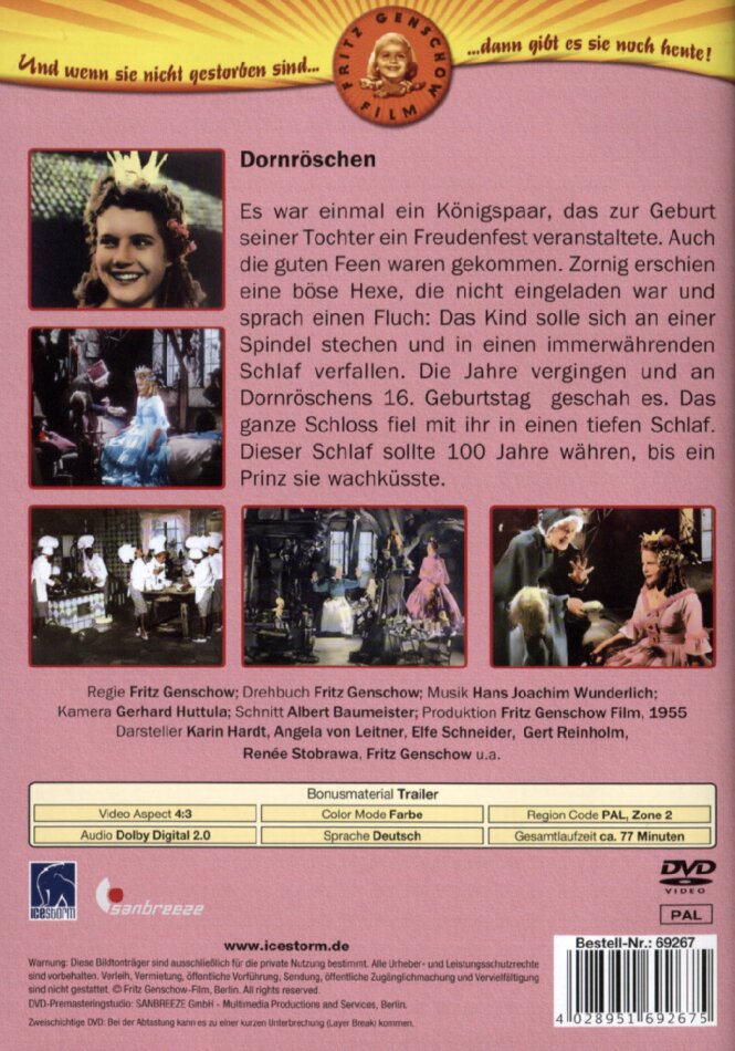Es war einmal ein Königspaar, das zur Geburt ihrer Tochter ein Freudenfest veranstaltete. Auch die guten Feen waren gekommen. Zornig erschien eine böse Hexe, die nicht geladen worden war, und sprach einen Fluch: Das Kind solle sich an einer Spindel stechen und in einen immerwährenden Schlaf verfallen. Die Jahre vergingen, und an Dornröschens 16. Geburtstag versank tatsächlich das ganze Schloß mit ihr in einen tiefen Schlaf. Erst nach 100 Jahren konnte ein junger Prinz den Zauber brechen, indem er Dornröschen wachküsste.