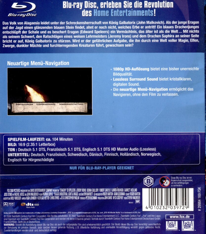 Eragon hat alles was man von einem Fantasy Hit erwarten kann. Da wären eine geniale Besetzung, eine fesselnde Story, ein sehr guter Soundtrack und nicht zu letzt die grandios inszenierten Action Szenen die mit ihren spektakulären Special Effekten überzeugen.