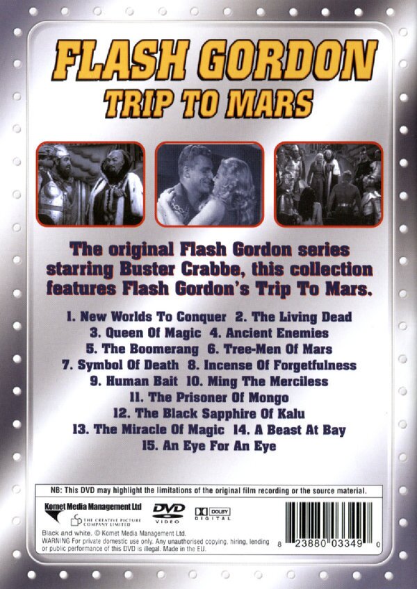This is the original 1938 serial film based on the comic strip Flash Gordon series starring Buster Crabbe. Another crisis is striking the Earth: a fictional chemical element called nitron is vanishing from the atmosphere, causing hurricanes and other meteorological disasters. Flash and Zarkov use an airplane to take measurements only to discover that a ray-beam from Mars is the source of the nitron depletion. A comical newspaper journalist, Happy Hapgood, arrives on the scene to get the scoop, and stows away when they, together with Dale Arden, leave to investigate in Zarkov's rocket ship. They discover that Azura, Queen of Mars, is working with Ming the Merciless, their old nemesis from Mongo, not dead as they had believed, to conquer earth. All Martians who oppose her have been turned into clay humanoids, consigned to live in a world of clay-walled caverns beneath the Martian soil. Flash, Zarkov, Dale and Happy take refuge from the Martians in one of these caverns and are captured by the Clay People, and taken to their Clay King. From him, they learn what is transpiring between Queen Azura and Ming, and anxiously agree to help.