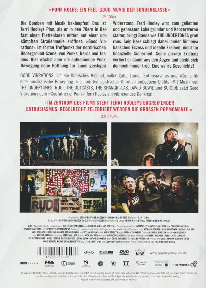 Die Bomben mit Musik bekämpfen! Das ist Terri Hooleys Plan, als er in den 70ern in Belfast einen Plattenladen mitten auf einer umkämpften Strassenmeile eröffnet. 'Good Vibrations' ist fortan Treffpunkt der nordirischen Underground-Szene, von Nerds, Punks, Rebellen und Teenies. Hier wächst über die aufkeimende Punk-Bewegung neue Hoffnung für einen geistigen Widerstand. Terri Hooley wird zum geliebten und gehassten Labelgründer und Konzertveranstalter, bringt Bands wie The Undertones gross raus. Sein Herz schlägt dabei immer für musikalischen Exzess und ideelle Freiheit, nicht für finanzielle Sicherheit. Seine private Existenz verliert er damit aus den Augen und bleibt sich dennoch immer treu. Eine wahre Geschichte.